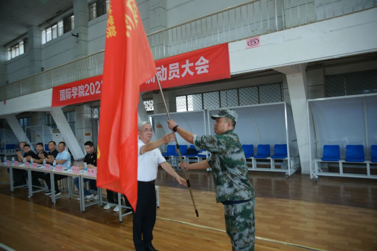 武京玉向新生军训团授军旗并宣布开营并预祝本次军训安全、顺利完成。