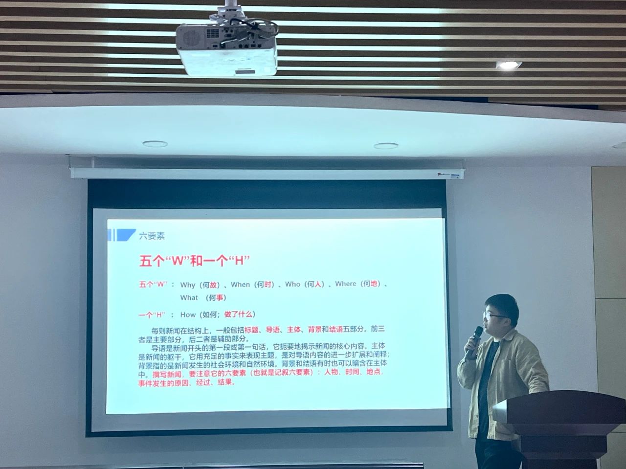 讲座伊始,朱恒江系统地向大家讲述了新闻稿的格式,以“三段式新闻”为例,简洁明了地让大家们了解新闻写作方法。他结合学院公众号的新闻片段,生动形象地讲述了新闻分段所需要的条件,让大家对新闻稿的格式有了清晰的认识。随后,他通过宣讲活动、专题分享会、专题讲座、个人会议四个框架讲解了不同类型新闻稿的要求,细致地将新闻中常用到的语句模板一一进行讲解。整个培训会由浅到深,让参会干事清晰了解到新闻稿的书写格式及规范。最后,朱恒江以讲解新闻中所要注意的问题结尾,对参会干事们提出殷切期望。