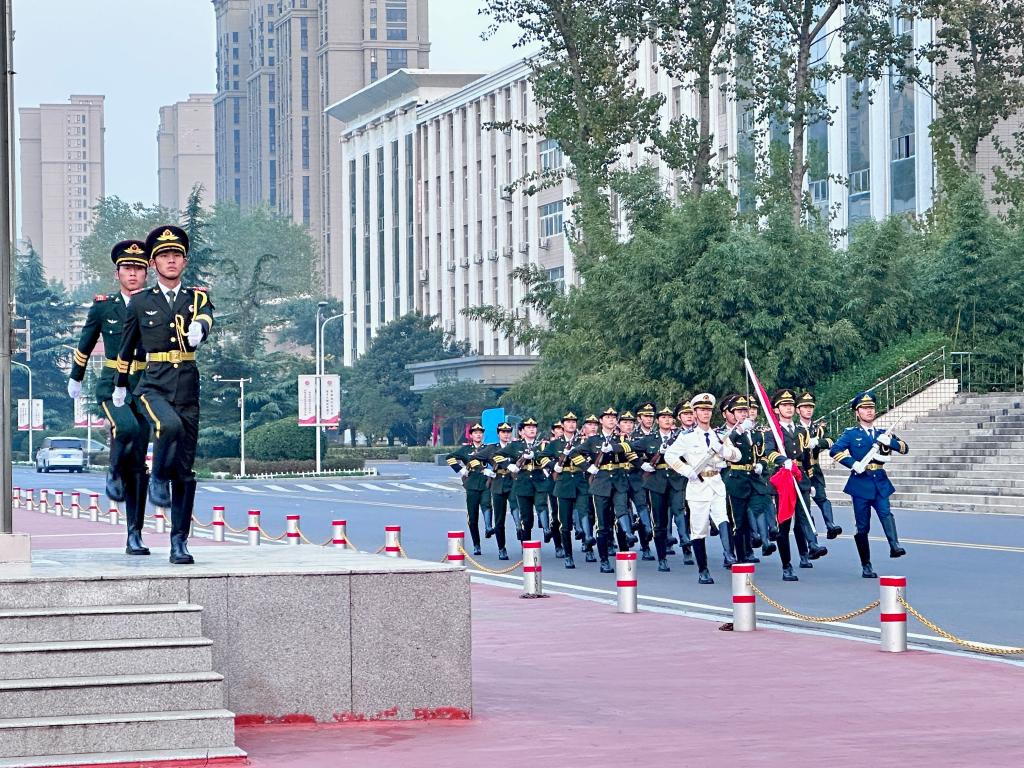 仪式伊始,国旗护卫队步伐整齐统一,行止间,展露国院学子的坚韧毅气,正步下,回荡铿锵有力的声响。奏唱国歌时全体师生歌声嘹亮,慷慨激昂的声音激荡操场。