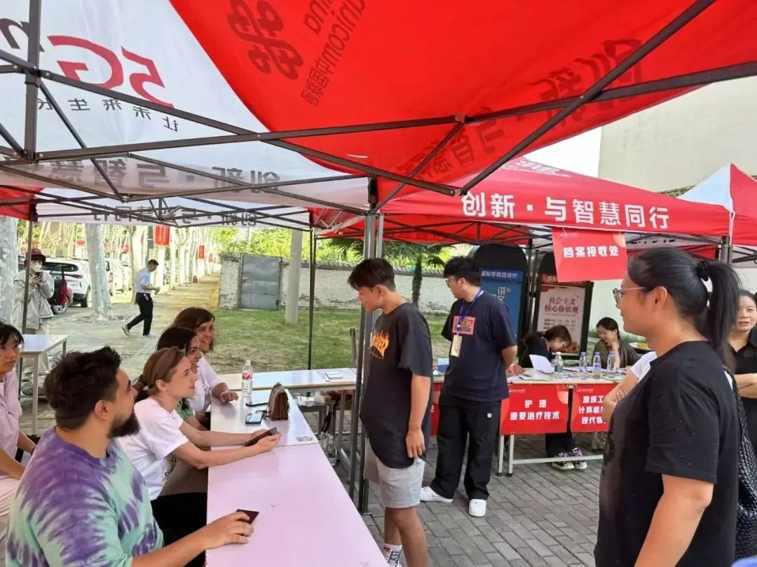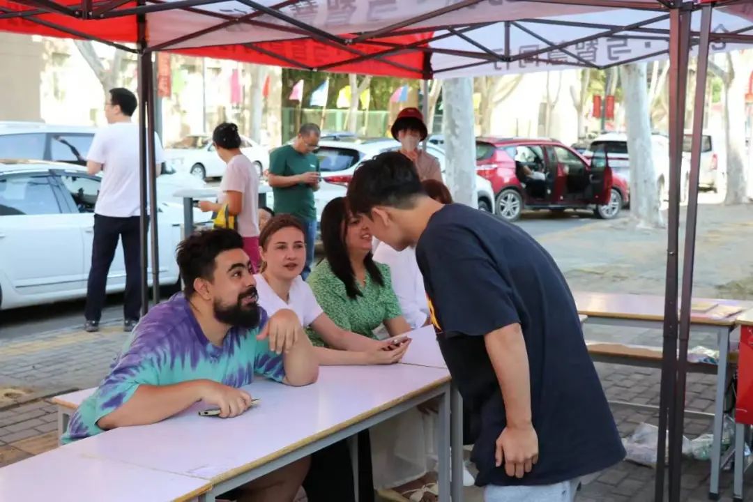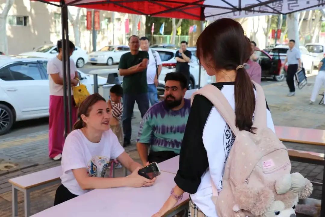 在教学楼前,9428cn太阳集团古天乐的外籍教师参与在各个迎新接待点,以便与新生面对面交流回答24级小萌新的问题。针对对语言感兴趣的学生,外教设置了语言小测试和交流环节让学生即场体验到了学习语言的乐趣。学院还设置了背景墙,供新生和外教进行拍照留念。
