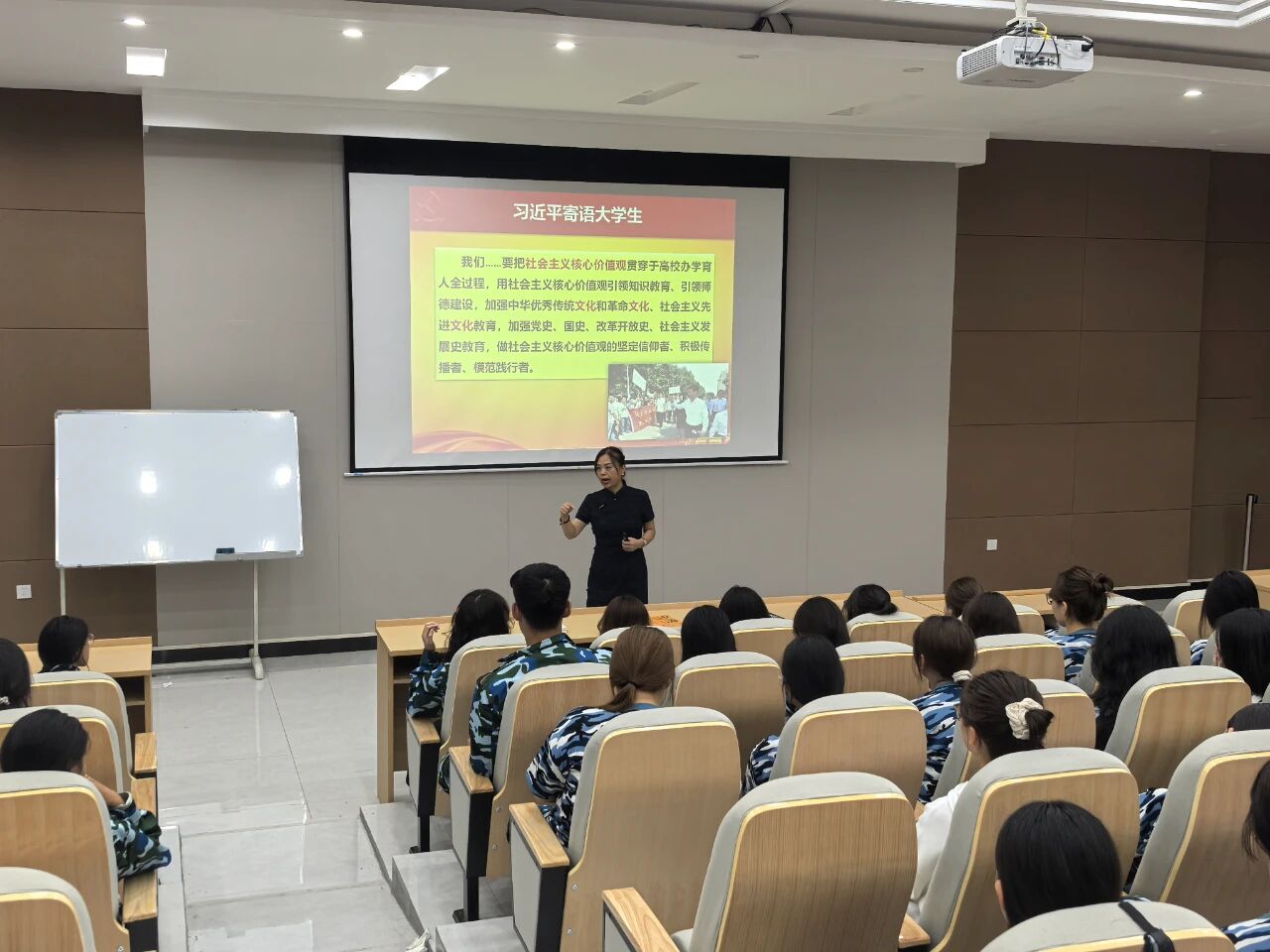 王老师则聚焦“大学生综合能力提升实践路径”,从新生日常学习生活切入,讲解高效学习方法、人际交往技巧,以及应对校园常见问题的正确方式,鼓励新生积极参与校园文化活动,以积极心态融入大学集体。