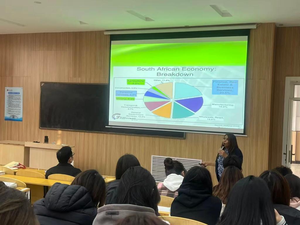 Bina老师结合南非国情,将本国经济的多元特征与经济学原理深度融合。她从南非GDP增长态势、矿产资源优势以及旅游业发展现状等方面切入,生动解析了南非的经济结构、失业率挑战与贫富差距等核心议题,借助详实的数据与鲜活案例,使抽象的经济学理论变得具体可感。在教学过程中,Bina采用互动式教学方法,积极引导学生主动思考。在最后的提问环节,学生们踊跃举手,围绕南非经济政策、中外经济发展差异等话题积极提问,Bina老师逐一细致解答,现场气氛热烈。