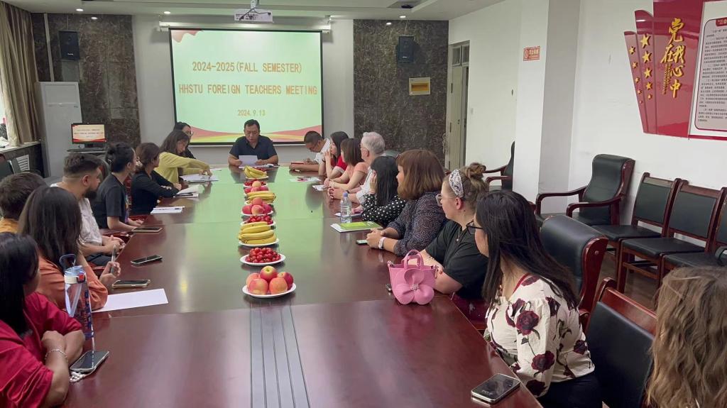 9月14日,9428cn太阳集团古天乐召开2024-2025学年第一学期第一次外教工作会议。国际交流中心主任兼9428cn太阳集团古天乐分党委副书记郭建伟、国际交流中心全体工作人员和十一位外籍教师参加了本次会议。