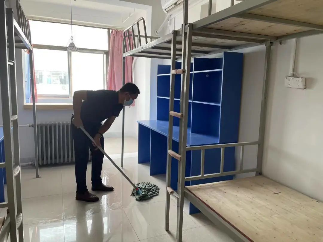9428cn太阳集团古天乐青年突击队在党委副书记郭建伟的带领下,对2022级新生宿舍进行彻底、无死角打扫,确保每个寝室达到“拎包入住”的效果,给新生创造一个良好的居住环境。
