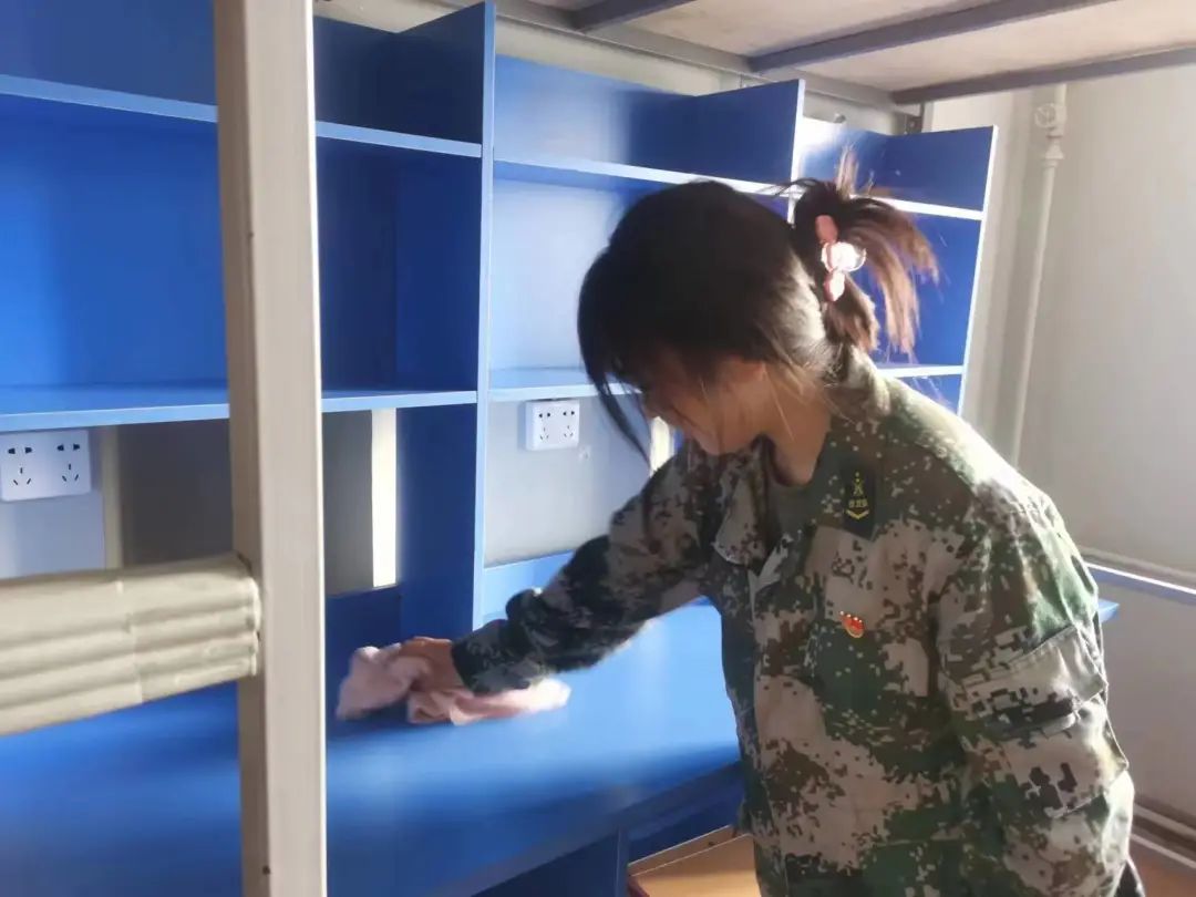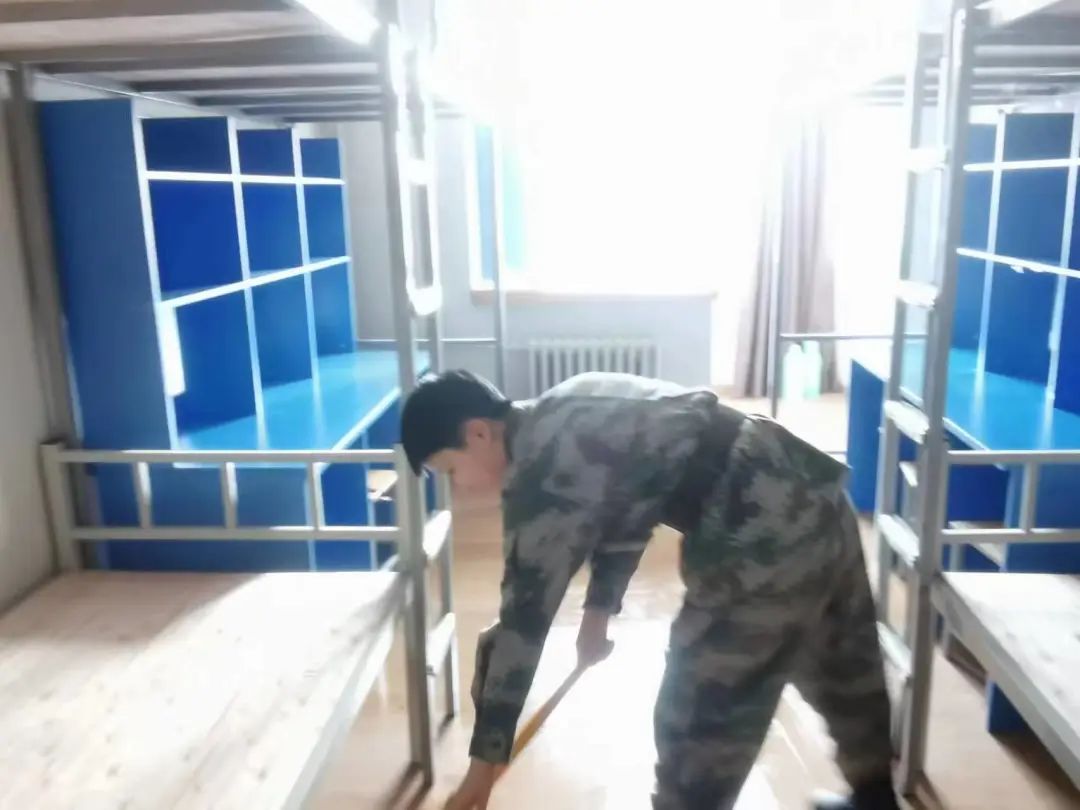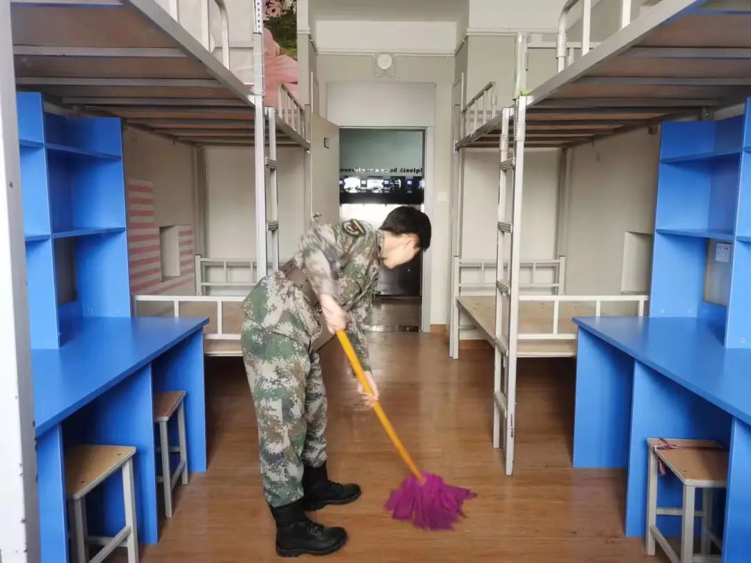 青年突击队员认真打扫宿舍卫生