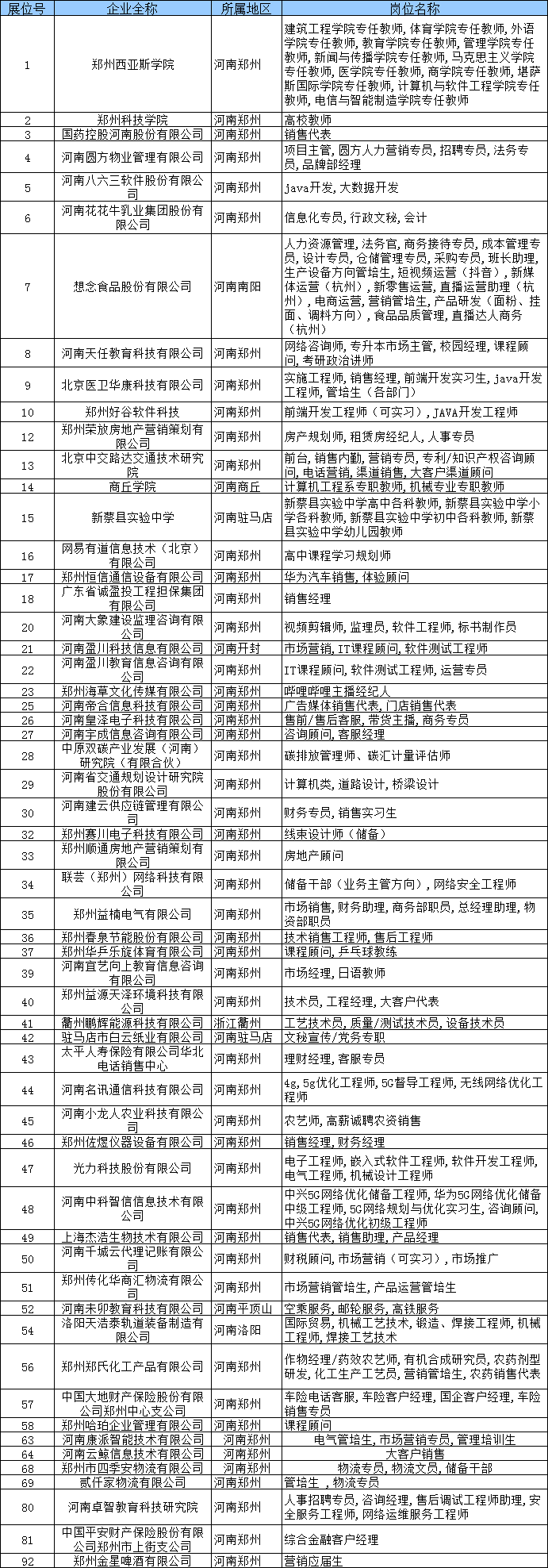 截至目前,郑州西亚斯学院、郑州科技学院、商丘学院、新蔡县实验中学、河南省交通规划设计研究院、国药控股河南股份有限公司、河南花花牛乳业集团股份有限公司、驻马店市白云纸业有限公司、想念食品股份有限公司、河南八六三软件股份有限公司、郑州郑氏化工产品有限公司、河南圆方物业管理有限公司等60余家高等院校、国有企业、上市公司、知名企业报名参会,提供岗位5000余个,用人单位持续报名中......