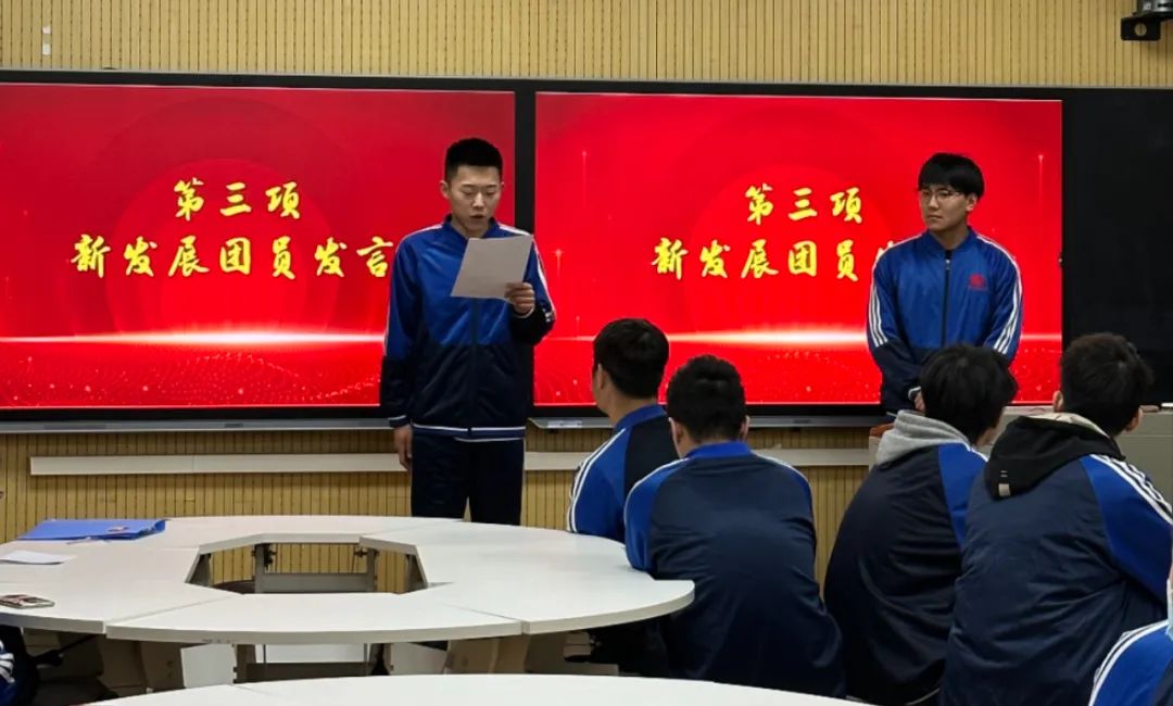 仪式在集体奏唱国歌中拉开序幕。首先,蒋雨果指出入团不仅仅是对自己身份上的一种改变,更是多了一份责任在身上,不能像以往一样,要更加严格的要求自身,给身边的同学们起到表率,不止是起到带头作用还有严于律己的精神需要永远铭刻在心中。新发展团员闫博锴作为代表发言,用自己的声音代替所有新发展团员来证明自己坚定加入共青团的决心,承诺可以扛起这一份光荣且艰巨的责任。随后蒋雨果为新发展团员颁发并佩戴团徽,这一枚小小的团徽佩戴在他们身上,不止是政治面貌转变的象征,更是监督自身的令牌。团徽颁发完毕后,团委部长冯金朝作为新发展团员代表带领新发展团员进行庄严的入团宣誓,在他们一句句坚定的誓词当中,可以明确感受到加入共青团的决心,希望新的血液可以带来新的力量。