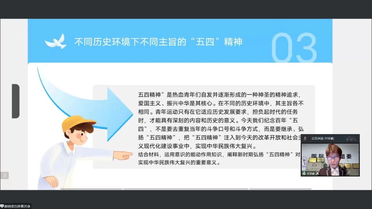 为了积极响应五四青年节的到来,培养学院学生青年强则国家强意识。5月4日,团委在腾讯会议上开展“挥洒青春,争做新青年”专题学习活动,团委全体干事参与本次活动,对外交流中心干事付宇豪主持本次会议。