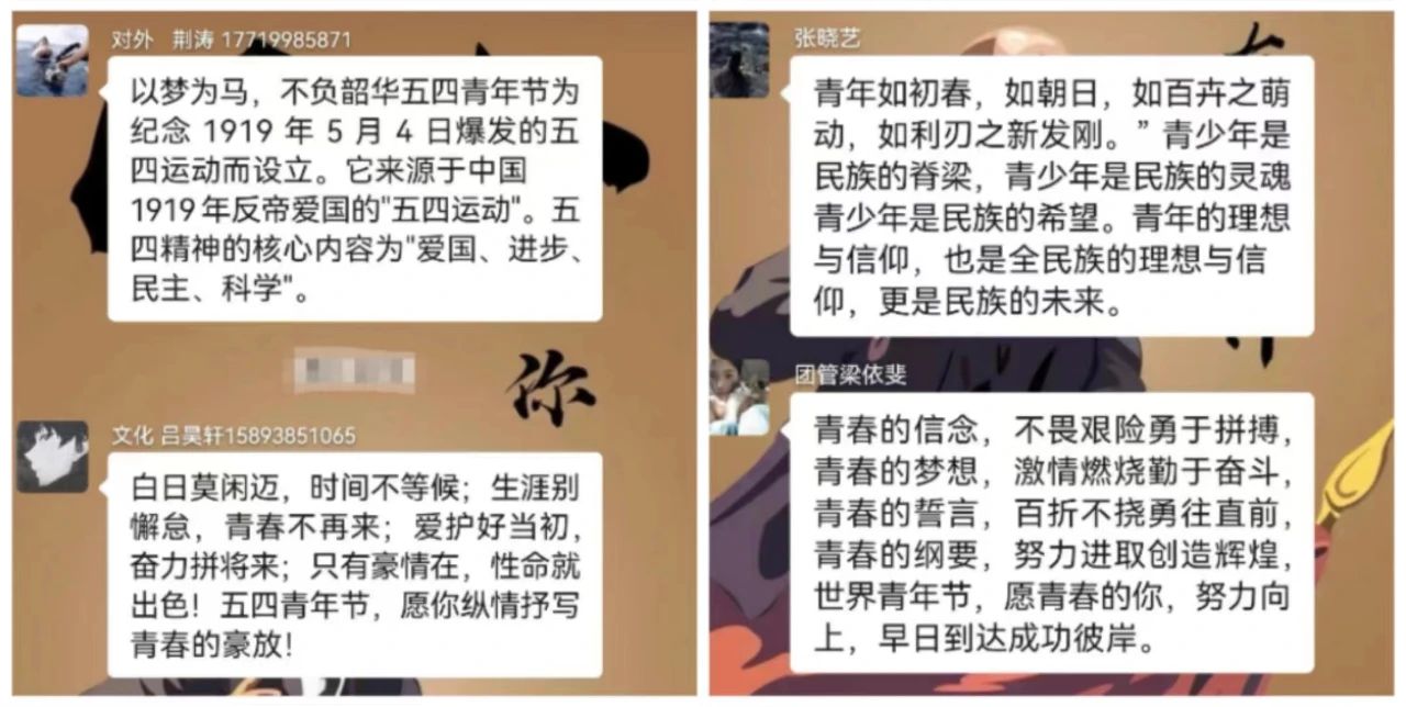最后,成员们自发的在聊天框中发表自己对于本次主题团课的感悟,用行动和文字来表明自己的决心,青年之志并非侃侃而谈,而是要用时间的沉淀来证明扛起新青年大旗的决心。