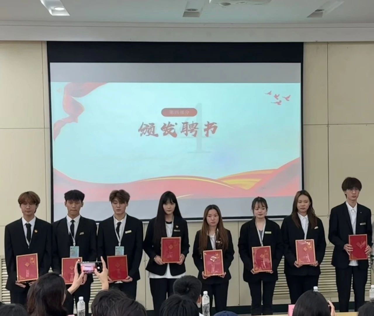 会议伊始,闫怡彤和于水源带领全体成员合唱团歌,在大家整齐嘹亮的歌声中,会议正式开始,由郑锃豪宣布对各部门部长任职决定,田嘉辉和郑怡琳为各部门部长颁发聘书并合影留念。郑锃豪表示,这是团组织的传统与精神传承,期望在新阶段开拓创新,激发团队潜力,推动学院团学工作上新台阶。随后,田嘉辉强调团委工作重要性,让干事们了解规章制度、纪律,鼓励各位干事积极工作、向团组织学习靠拢。接着,各部门部长及干事进行才艺展示,带动全场气氛。四个部门部长代表也分别上台发言,总结过去工作并规划新学期工作方向。最后,团委全体成员合影留念,大会圆满落幕。