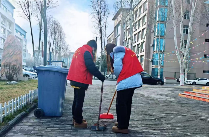 教学楼下,两位志愿者身着标志性的红马甲,投身于校园清洁志愿服务中。她们专注地配合着,一位手持簸箕,微微下蹲,准备接住垃圾;另一位挥动着红色扫帚,不放过砖石路面的任何一处缝隙和角落。志愿者们的身影,在这样的环境中显得格外温暖且充满力量,她们用实际行动传承着雷锋精神,让无私奉献的光芒在校园里闪耀。
