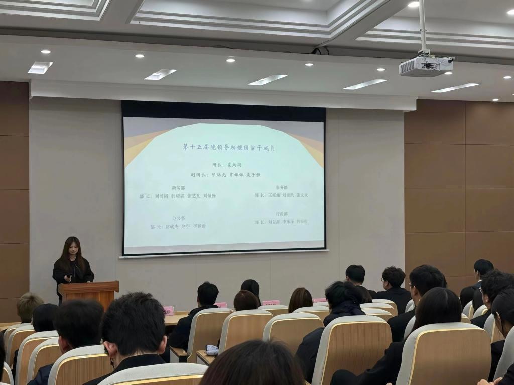 仪式第一项,主持人向在场成员介绍了助理团秉持的“服务学院、团结伙伴”初心,对往届成员的辛勤付出致以诚挚感谢,肯定其为团队积累的宝贵经验与奠定的坚实基础。随后,上一届团长刘佳玮致开幕词及宣读新一届成员名单,现场响起热烈掌声,向新晋成员送上祝贺。